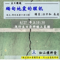 經文:耶利米書十章10節.大綱:三月28日緬甸北部發生震距規模7.7的淺源強烈地震,地表強烈搖晃造成震央周邊地區數萬棟建築物倒塌,道路毀損橋梁崩塌,引發山區大規模土石流,阻斷主要聯外道路,至今已造成數千人傷亡,數十萬民眾受困災區,是今年迄今最嚴重的天災。三月19日,世界氣象組織發佈《2024年全球氣候狀況》報告指出,2024年是有氣象記錄以來最熱的一年,除了極端天氣以外,氣候暖化還會影響全球的地震活動,是我們這個世代必